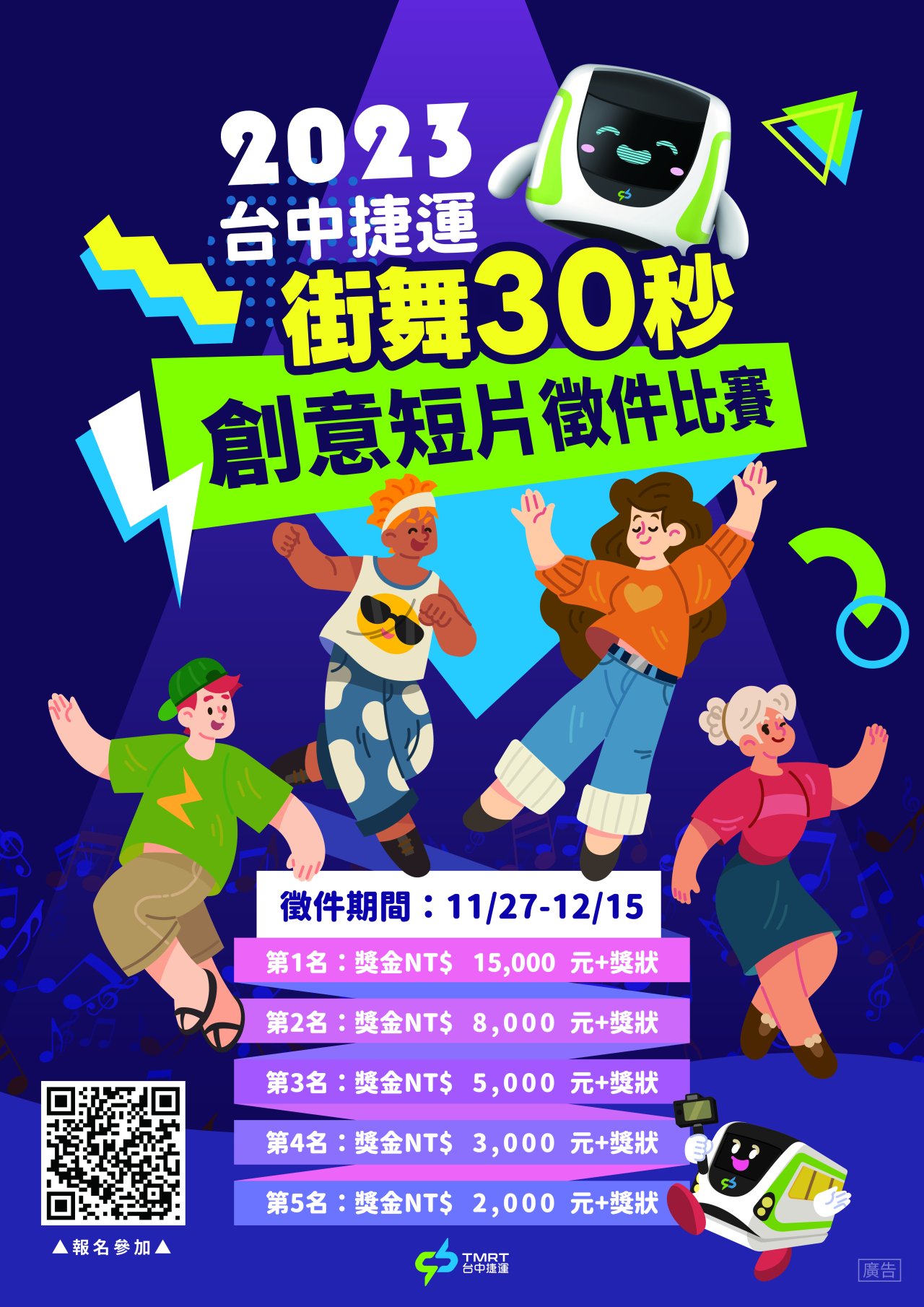 一、旨揭活動自112年11月27日(一)至112年12月15日(五)止, 參賽者須於捷運舊社站1樓「捷舞103」練舞場地,拍攝舞 蹈短片並完成線上報名流程,即可參加比賽,總獎金達新 臺幣3萬3,000元。